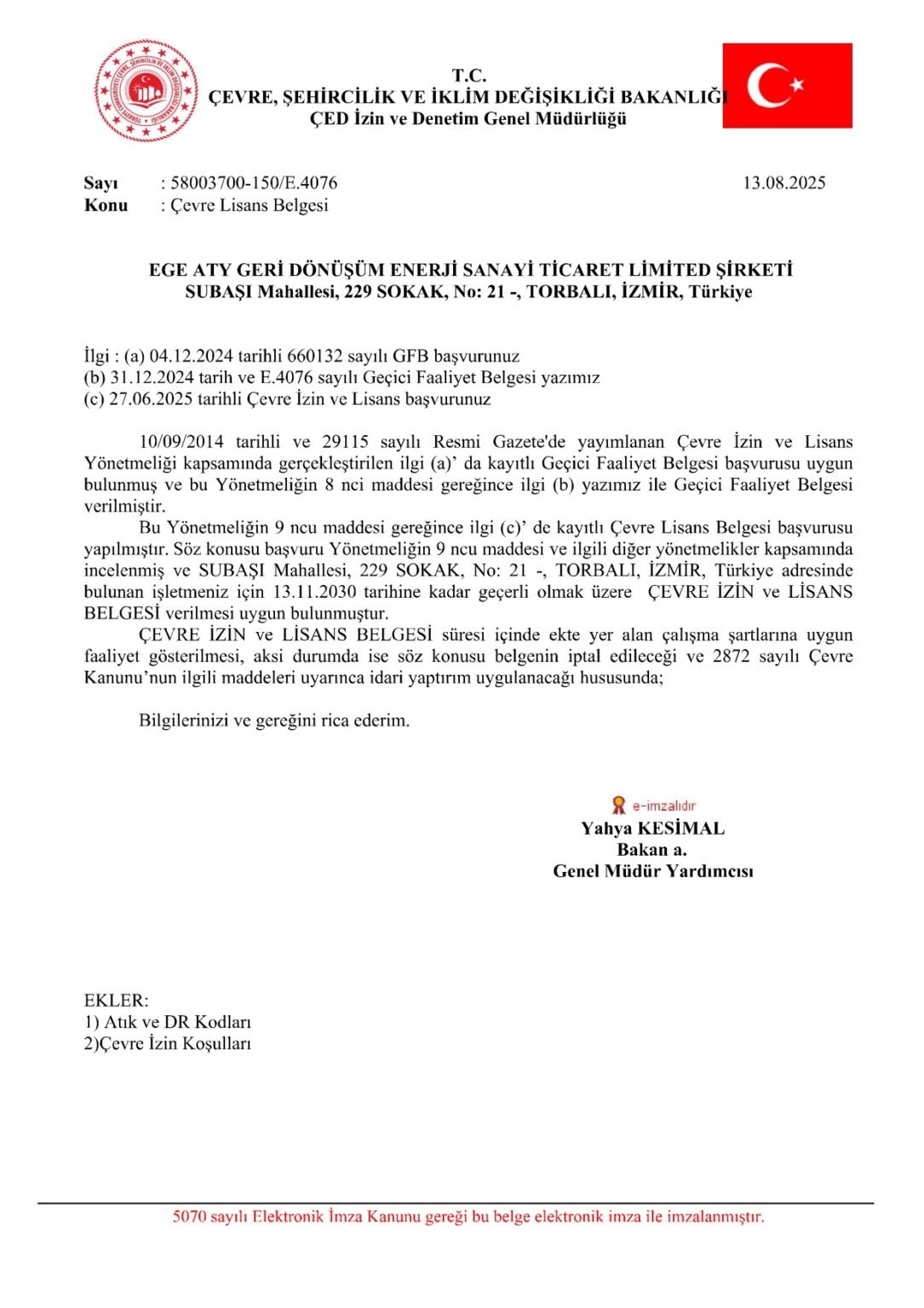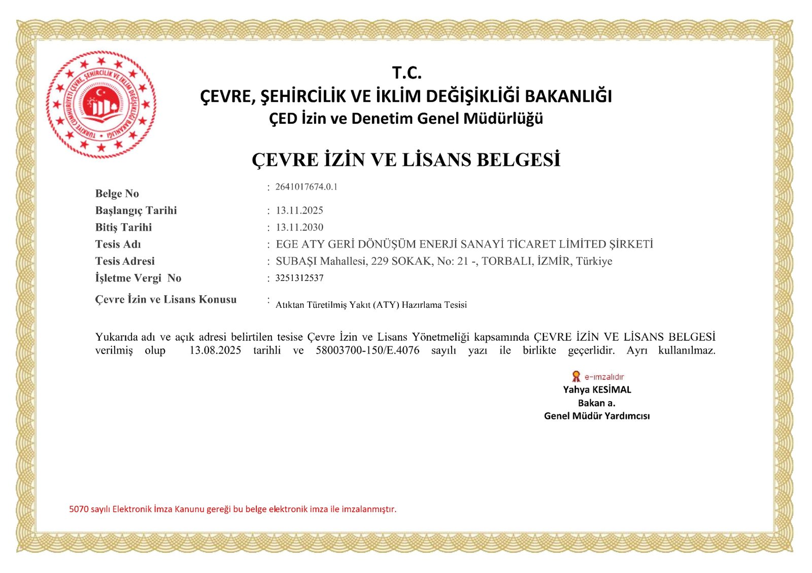 Ege Atık Yönetim olarak tüm hizmetlerimizi, Çevre, Şehircilik ve İklim Değişikliği Bakanlığı tarafından verilen gerekli izin ve lisanslarla yürütüyoruz. Yasal gerekliliklere tam uyum sağlayarak güvenilir, şeffaf ve denetlenebilir atık yönetimi hizmetleri sunuyoruz.